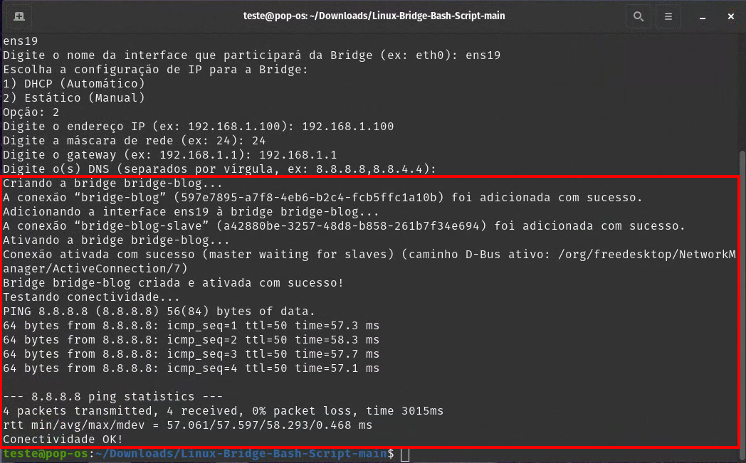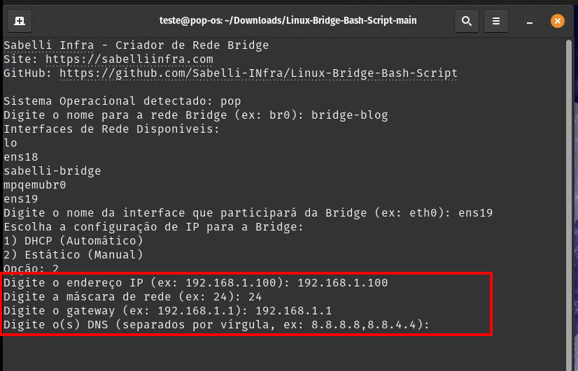 Basta preencher todos dados e então o script configurará e testará a conexão de rede.