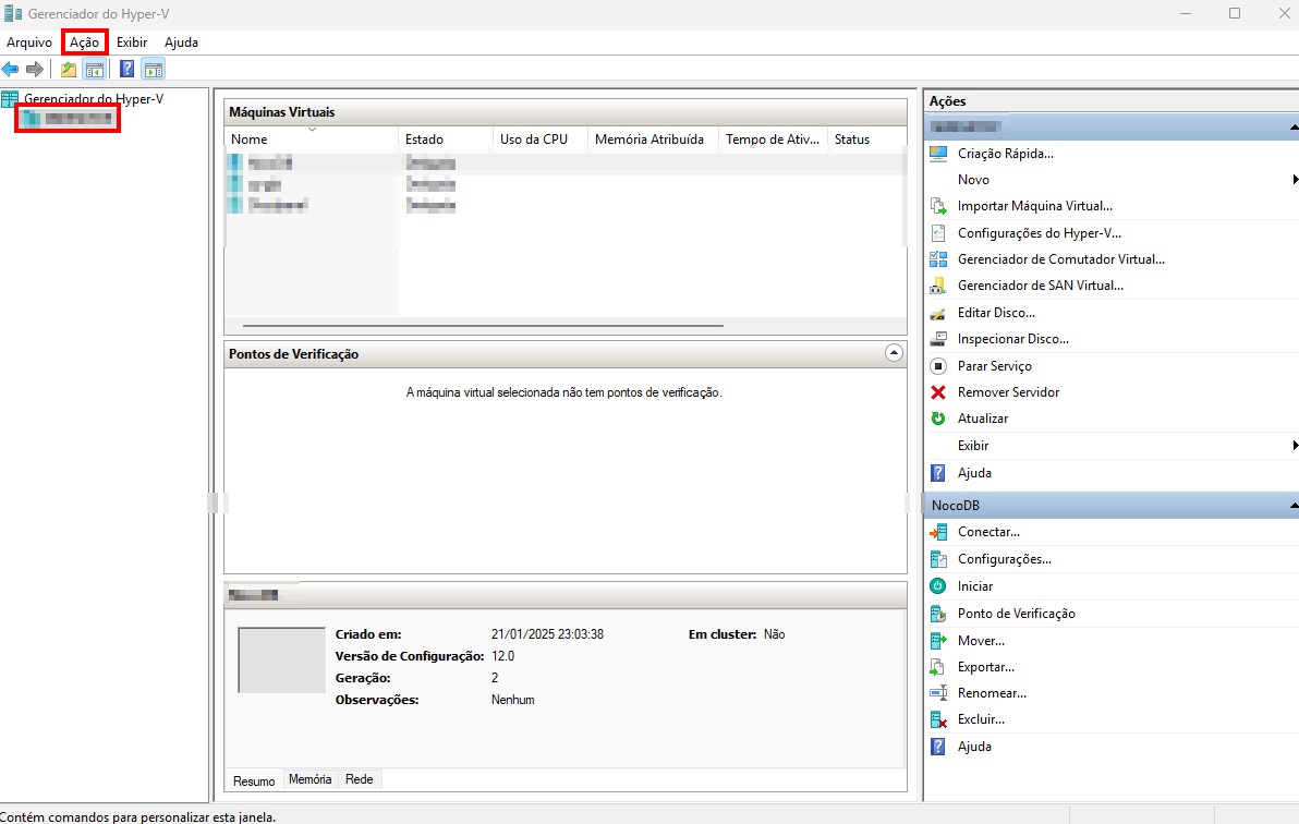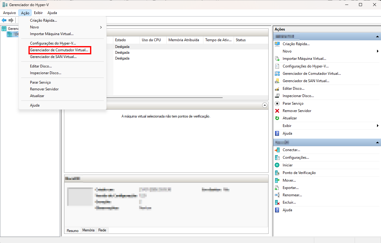 Para criar uma rede bridge no Hyper-V é muito simples primeiro abra o Hypervisor selecione o servidor em que deseja criar a bridge e depois clique no menu superior Ação: