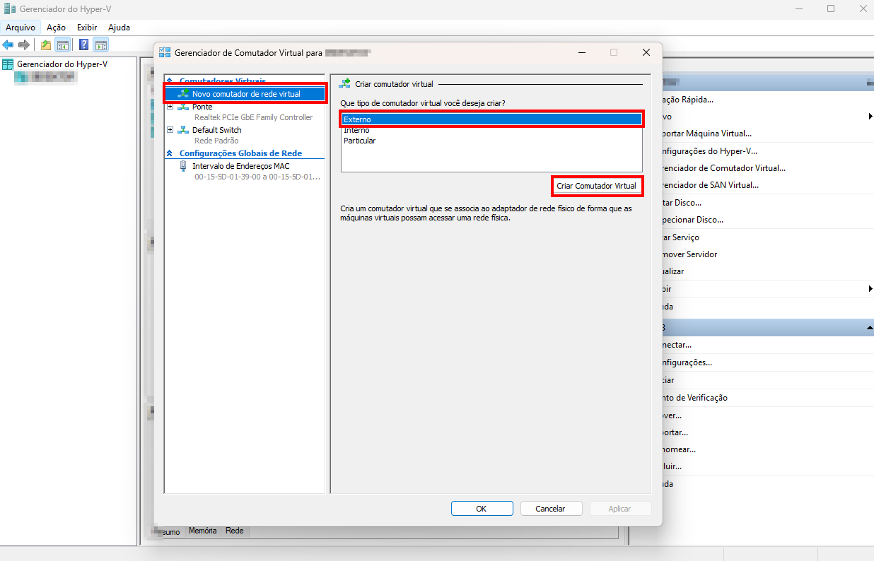Depois podemos clicar em Novo Comutador virtual Selecionaremos a opção Externo e por ultimo Criar Comutador Virtual