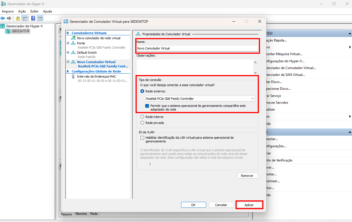Na Seção Tipo de conexão seleciona a placa de rede física que você quer utilizar e clique em Permitir que o sistema operacional de gerenciamento compartilhe este adaptador de rede e depois clicaremos em aplicar.