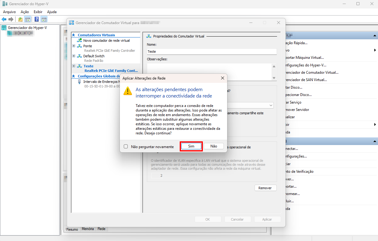 Em seguida o Hyper-V Ira gerar um aviso de que conexão a internet pode ser interrompida durante a associação da interface física a bridge é só clicar em sim para porsseguir