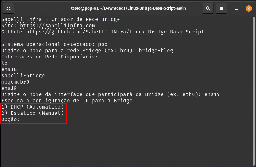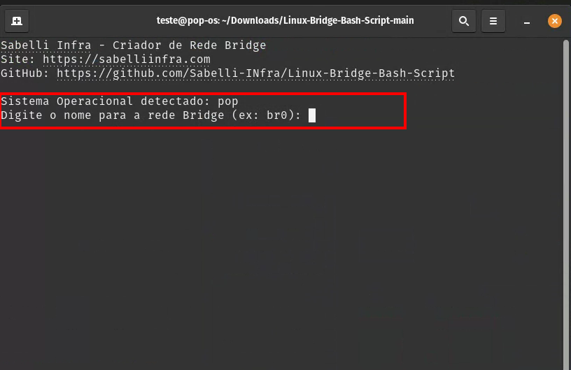sudo bash Linux-Bridge.shAo executar o script iremos escolher o nome que queremos dar para a nossa rede bridge