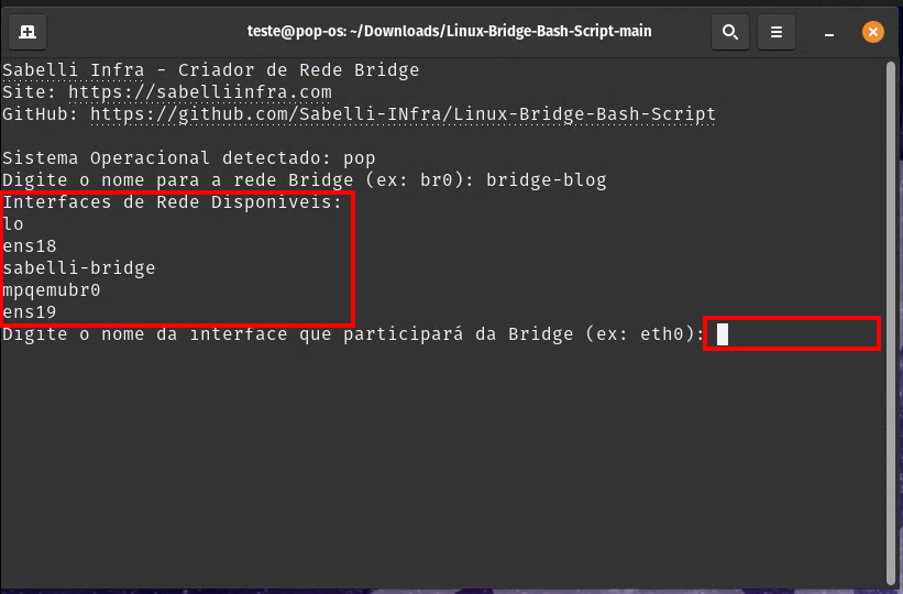 Em seguida o script irá listar a interfaces disponíveis, basta digitar o nome da interface física que fará parte da rede
