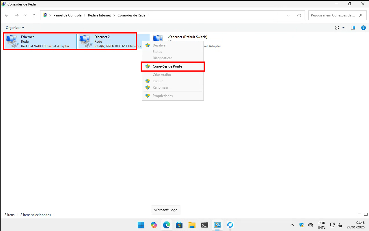 3 - Selecione duas ou mais interfaces, clique com o botão direito e escolha Conexão de Ponte (Bridge).