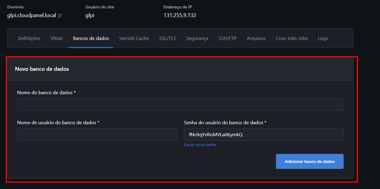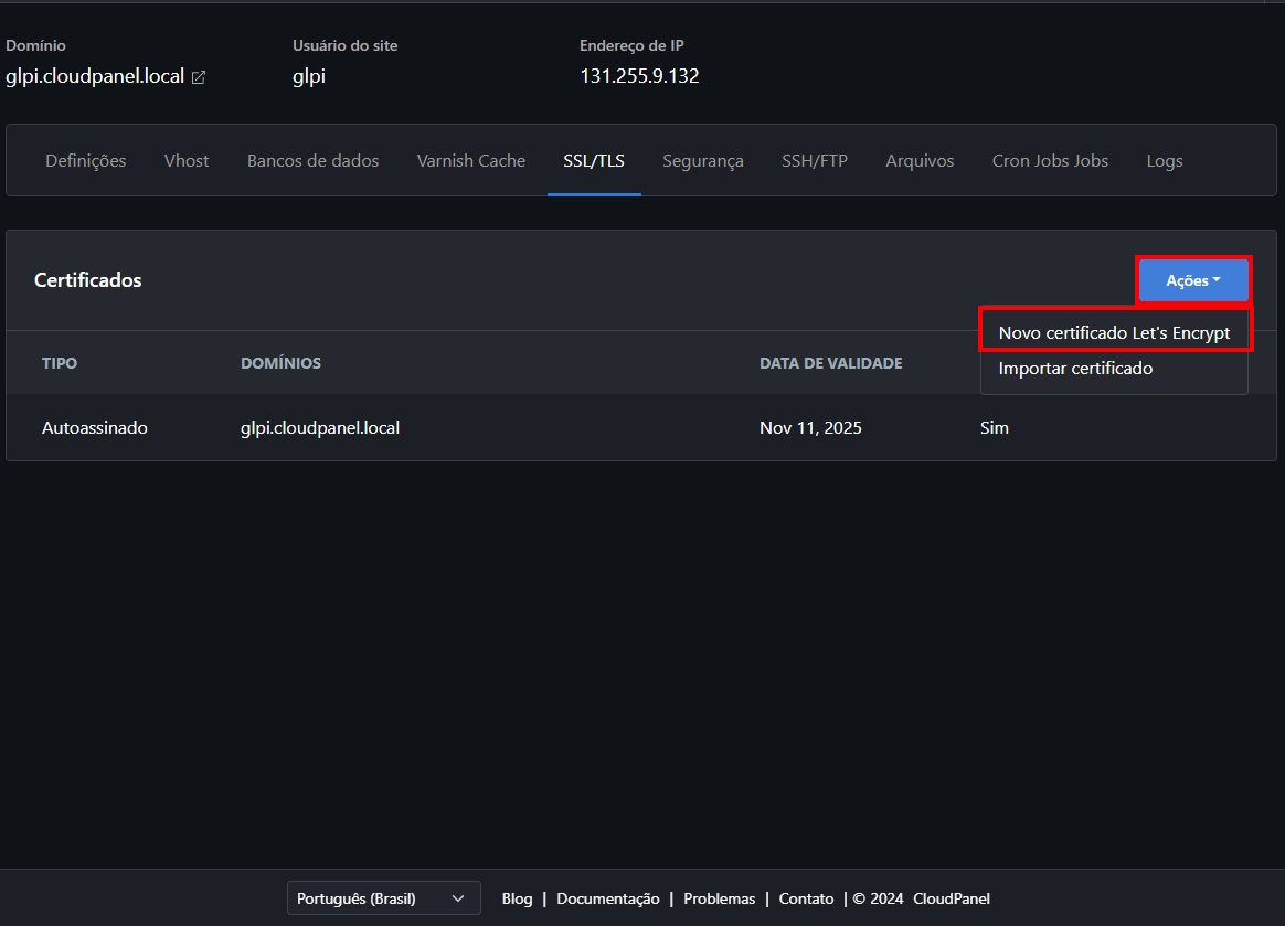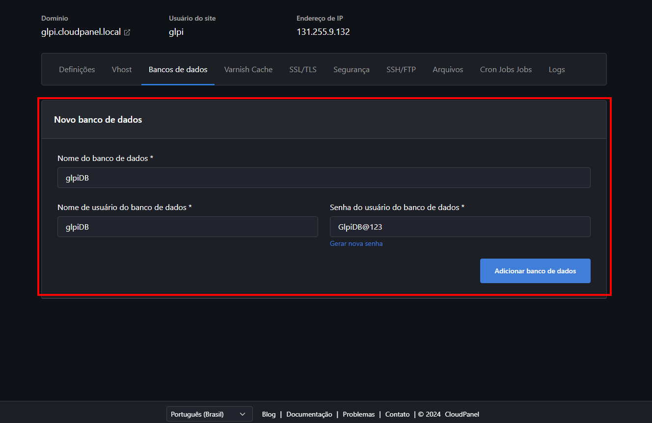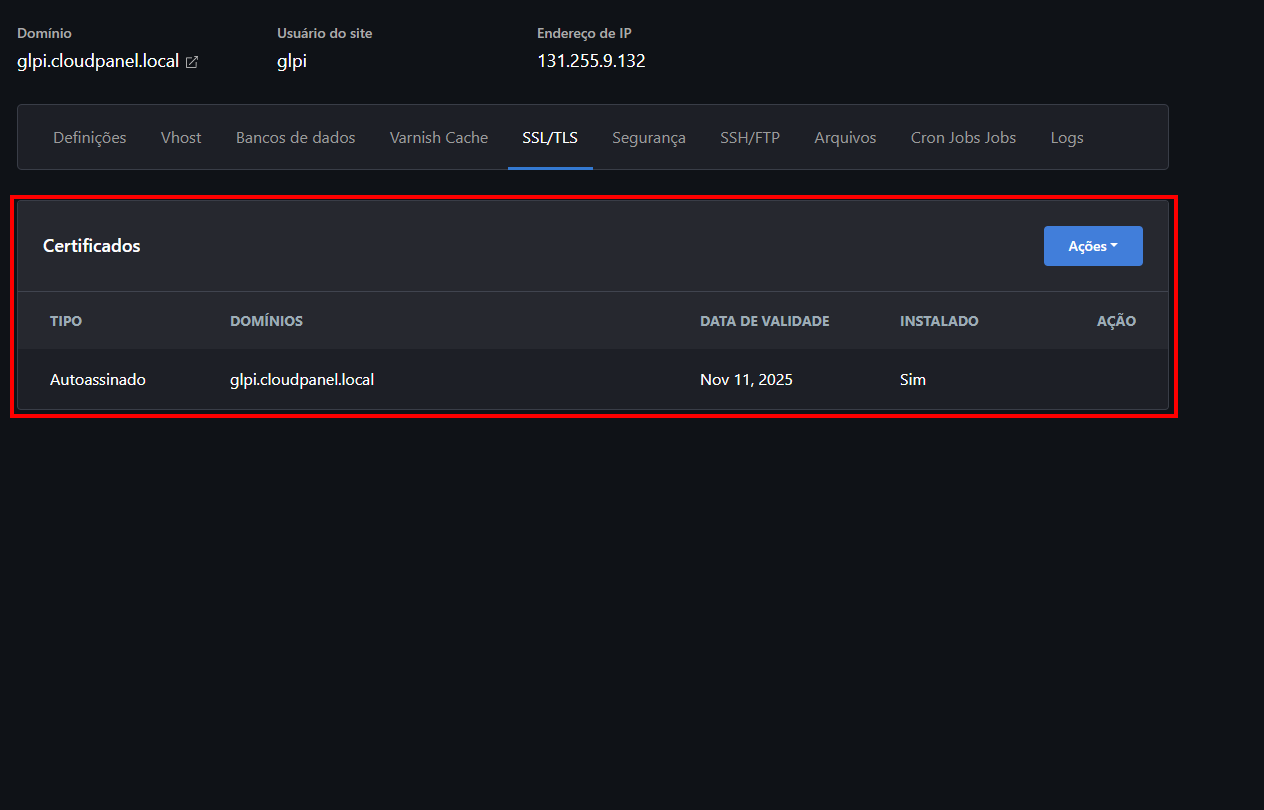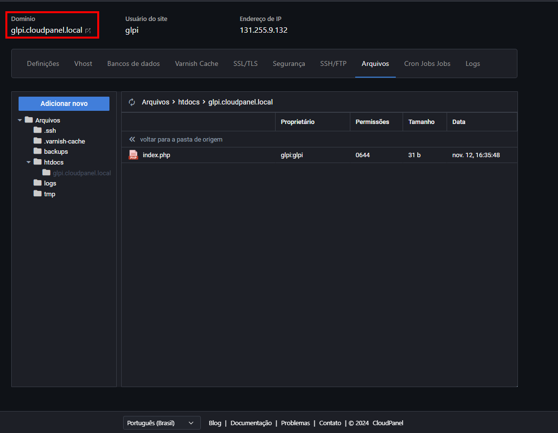 E se você quiser usar outro domínio? Tranquilo! É só trocar o "glpi.cloudpanel.local" pelo domínio que você preferir.