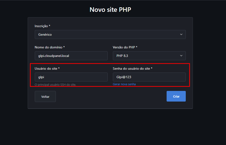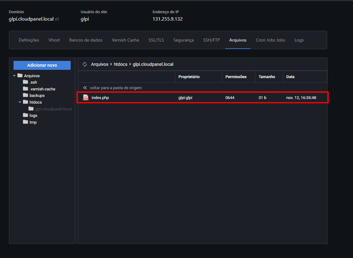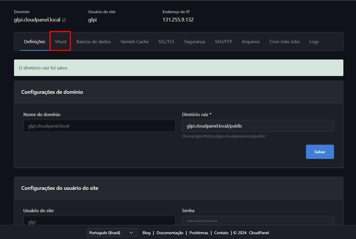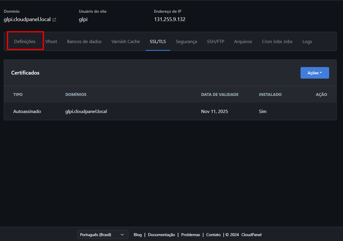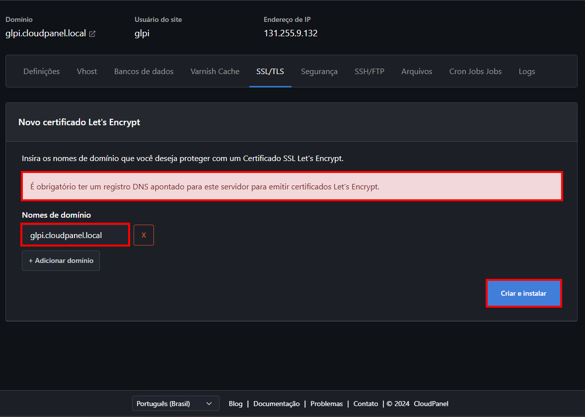 E se você quiser usar outro domínio? Tranquilo! É só trocar o "glpi.cloudpanel.local" pelo domínio que você preferir.