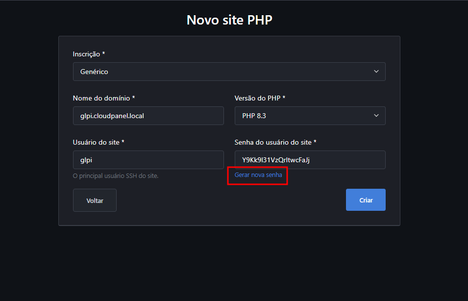 Mas atenção, galera! Lembram daquela dica que demos lá no item 7 do passo um? Pois é, se você tá pensando em colocar o GLPI pra rodar de verdade, numa empresa ou algo assim, é super importante escolher uma senha bem forte. Mas assim como na hora de criar um site, o CloudPanel dá uma mãozinha nisso também, com um gerador de senhas automático.
