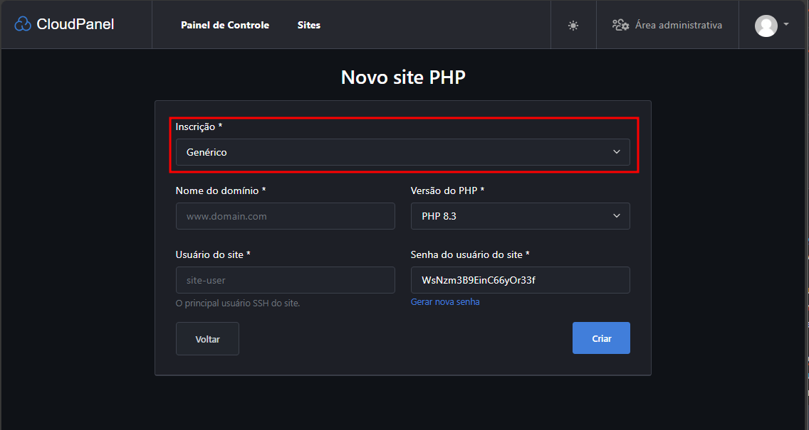 E relaxa, não precisa ficar quebrando a cabeça para criar uma senha complicada. O CloudPanel é seu parceiro nessa missão! Ele tem um botãozinho azul mágico que gera uma senha forte automaticamente. Dá só uma olhada na imagem abaixo: