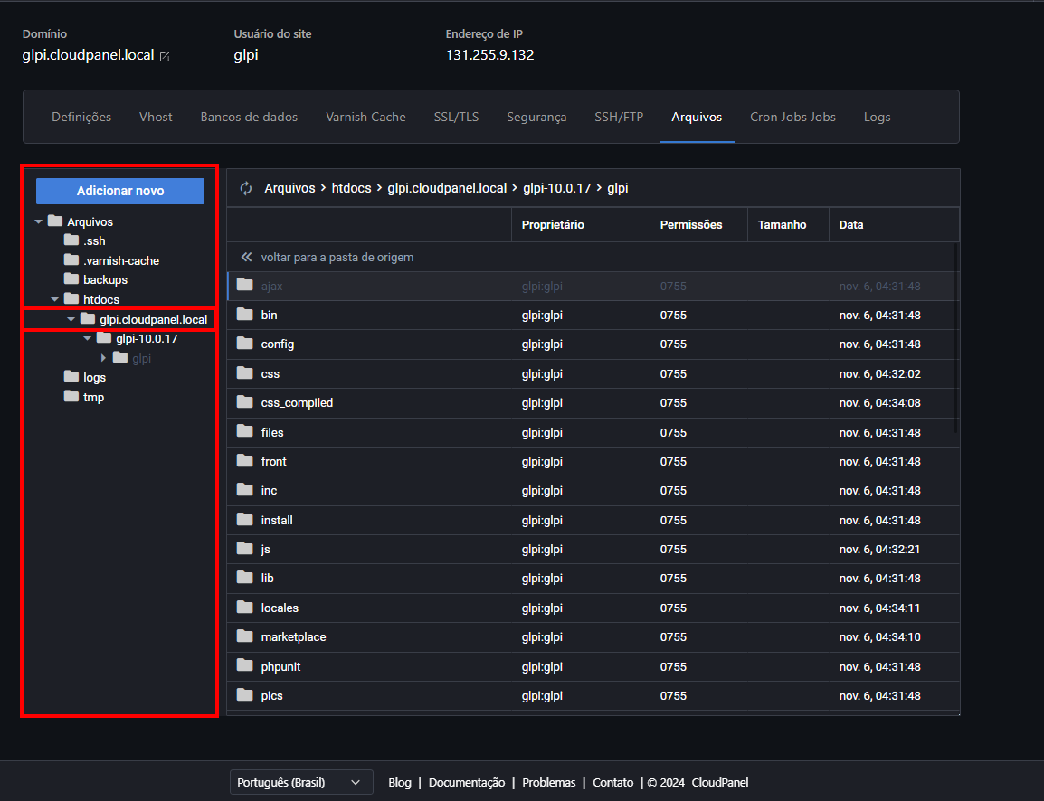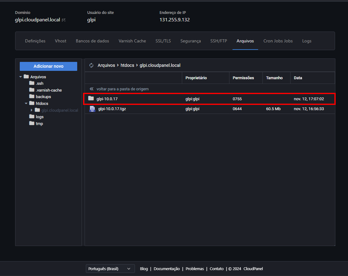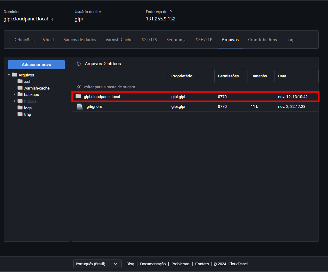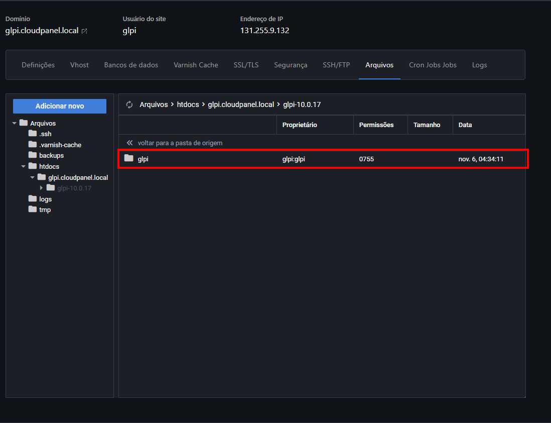 Agora vamos entrar na pasta do nosso site. Sabe aquele nome de domínio que a gente escolheu lá no começo? Pois é, a pasta tem exatamente esse nome! No nosso caso, é "glpi.cloudpanel.local":