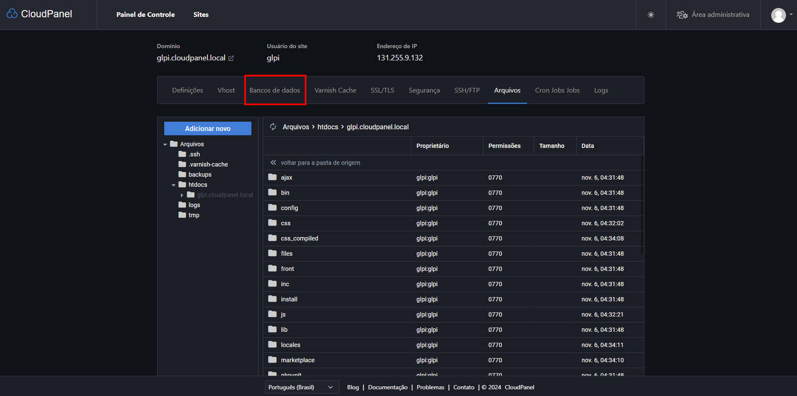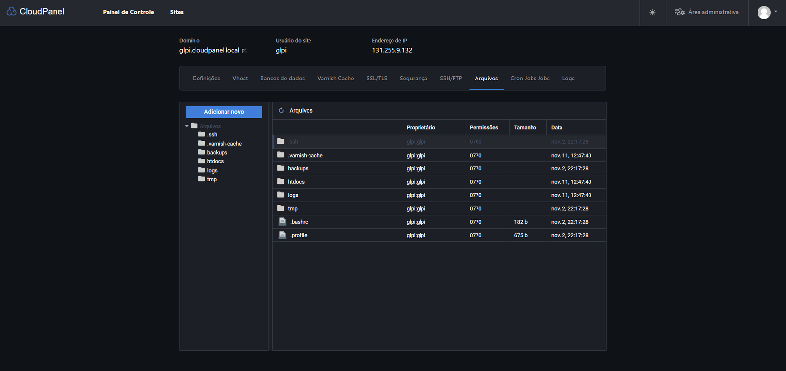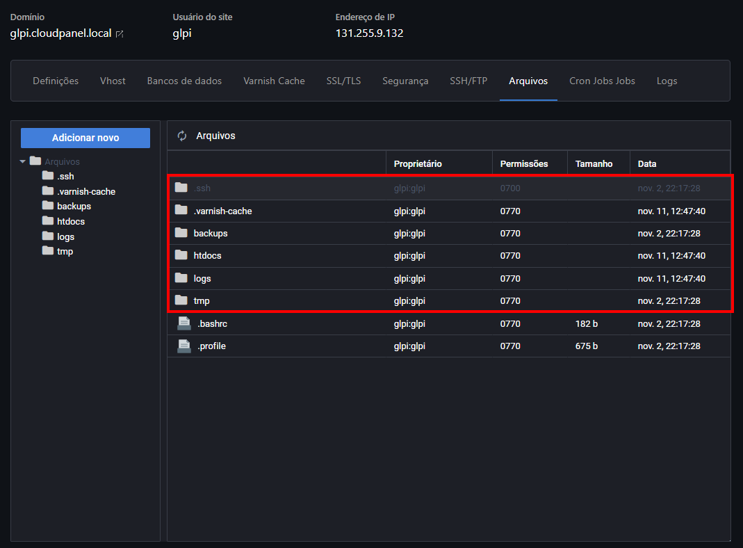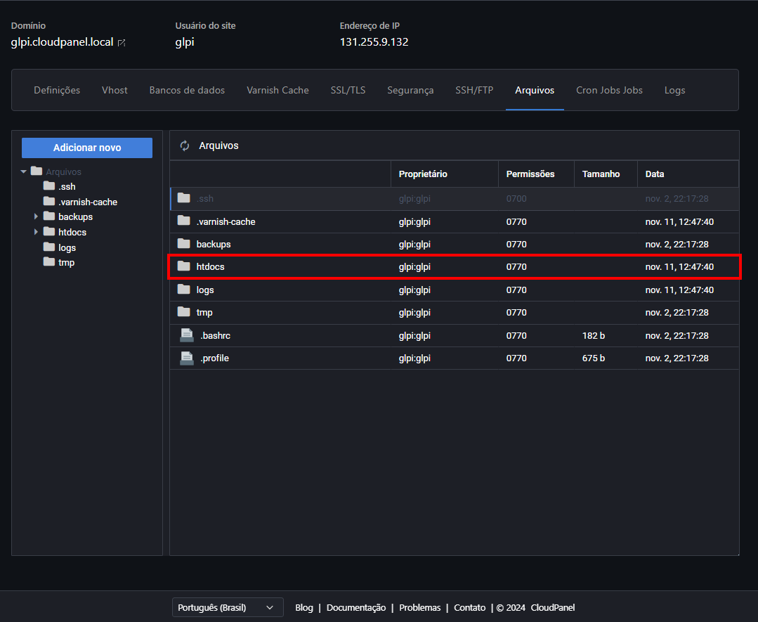 Agora vamos entrar na pasta do nosso site. Sabe aquele nome de domínio que a gente escolheu lá no começo? Pois é, a pasta tem exatamente esse nome! No nosso caso, é "glpi.cloudpanel.local":