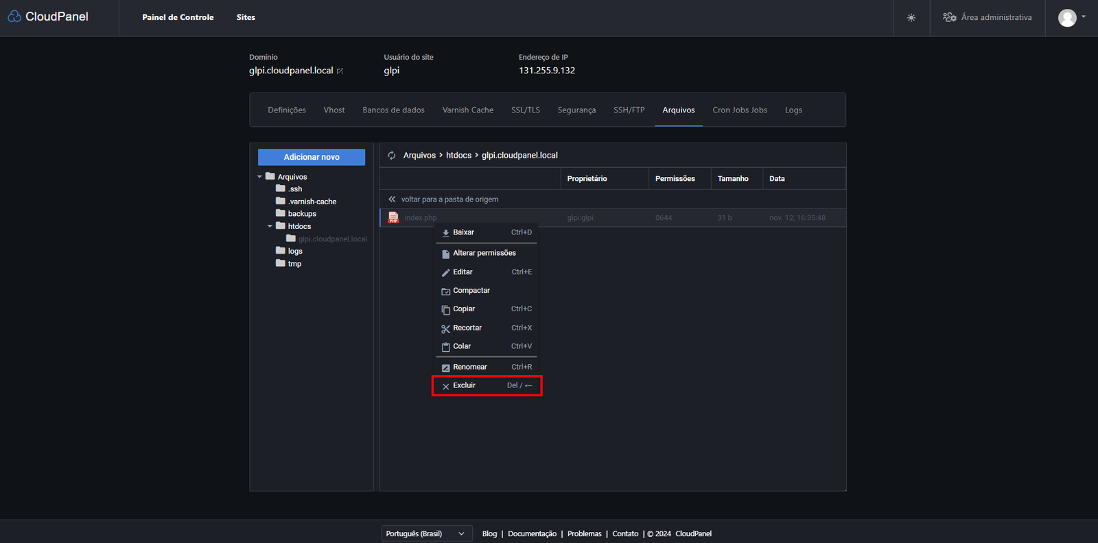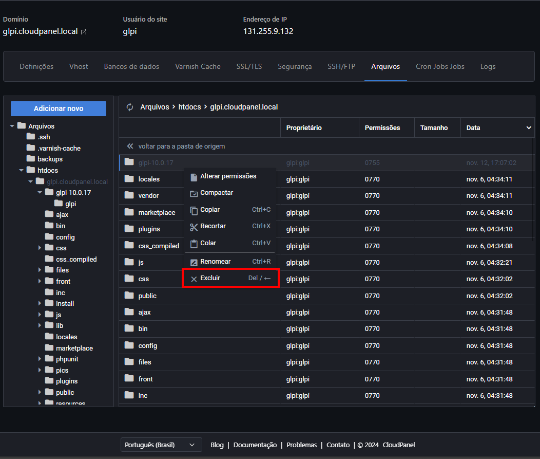 Para remover o arquivo install.php, é simples! Vamos voltar pro Cloud Panel, entrar na seção "Arquivos" e usar o gerenciador de arquivos. Lá, a gente vai navegar até a pasta "htdocs", depois entrar na pasta com o nome do domínio do site, e finalmente na pasta "install". Aí é só apagar o arquivo install.php — pode ser apertando delete ou clicando com o botão direito e escolhendo "excluir":