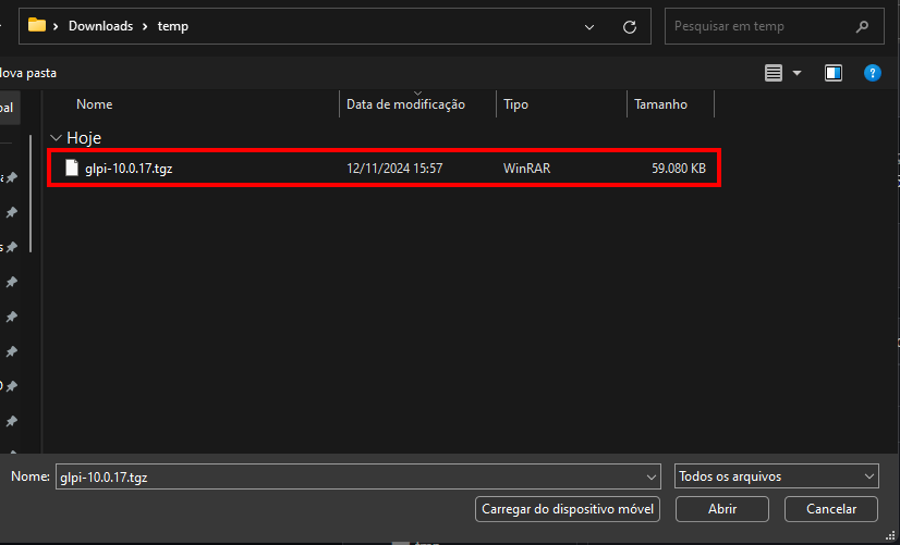 Agora, galera, é hora de escolher o arquivo do GLPI que a gente baixou. Lembram daquele arquivo .tgz que a gente pegou lá no site oficial? Então, é ele mesmo que vamos usar agora: