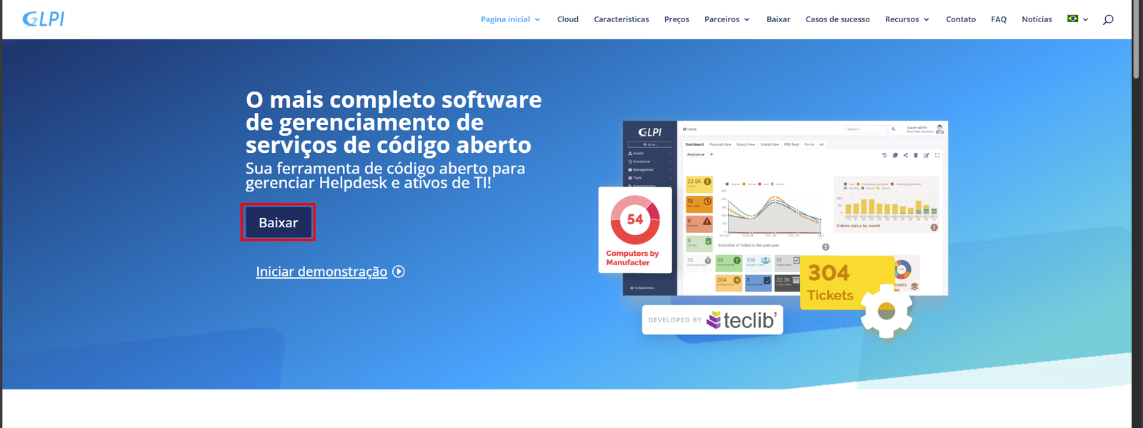 1 - Primeiro, vamos acessar o site do GLPI neste link: página inicial - GLPI Project. Quando a página abrir, você vai ver uma tela com várias informações sobre o GLPI. Não se assuste, é só procurar pelo botão azul de "Baixar" - é ele que a gente quer!