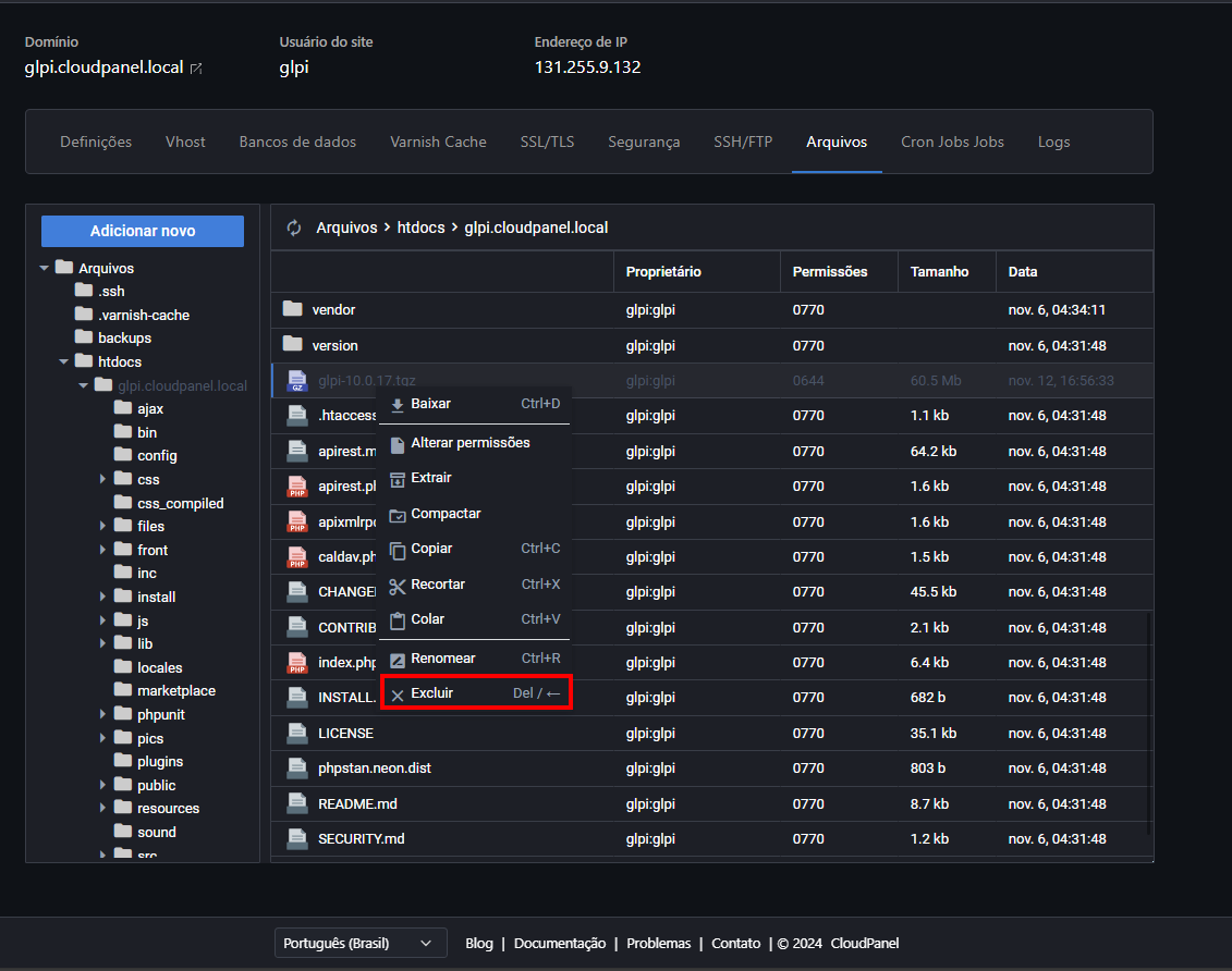 Está na hora de dar tchau pra pasta e pro arquivos compactado do GLPI. Hora da faxina !! É só clicar em cima de cada arquivo com o botão direito e selecionar a opção excluir: