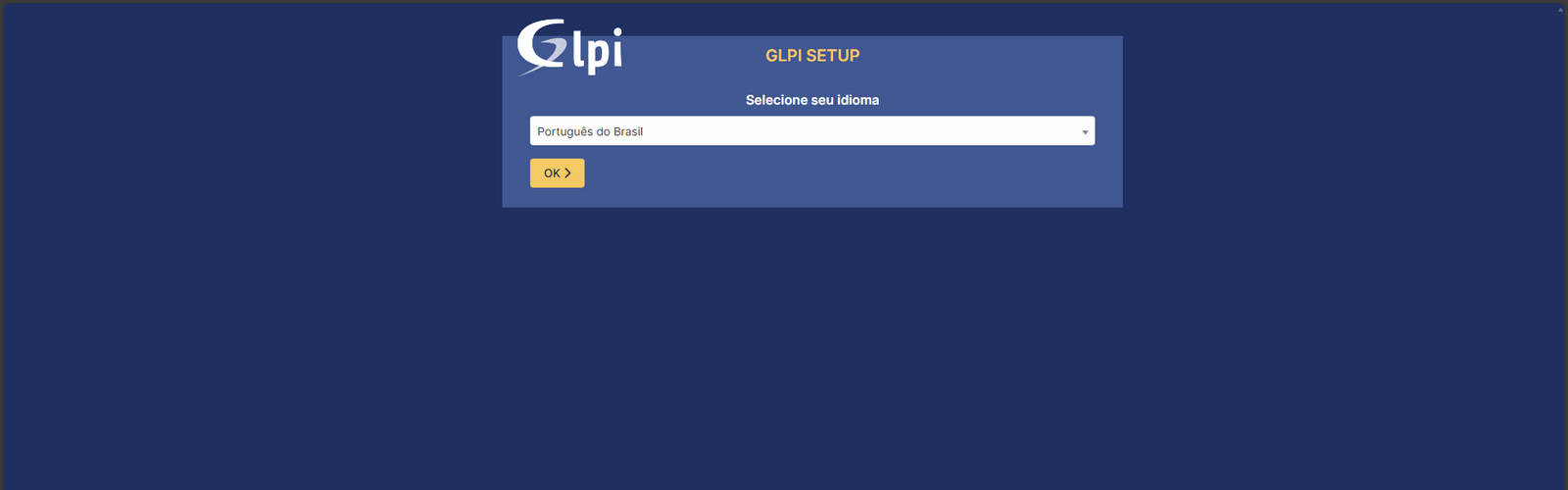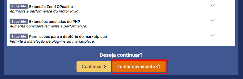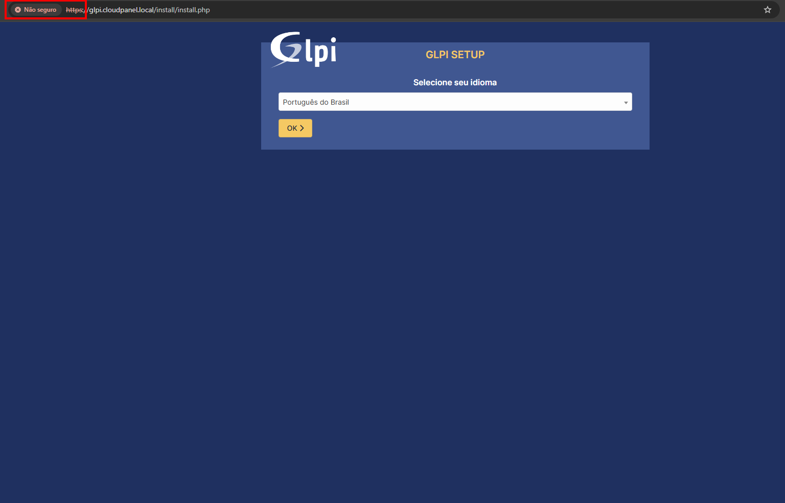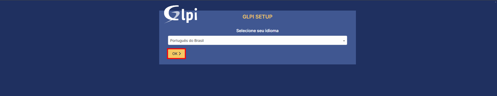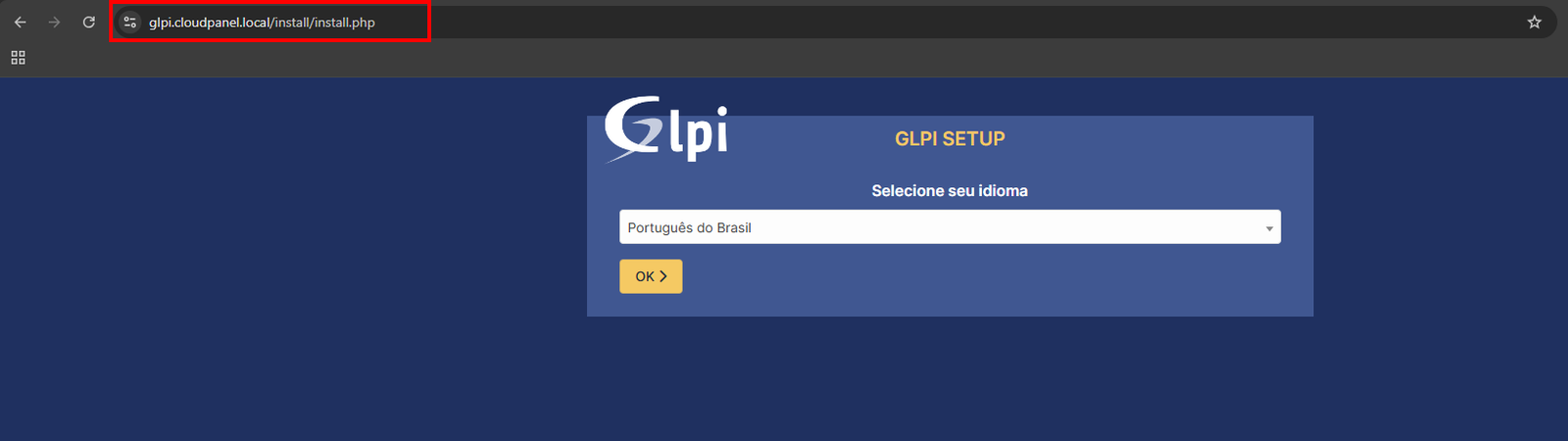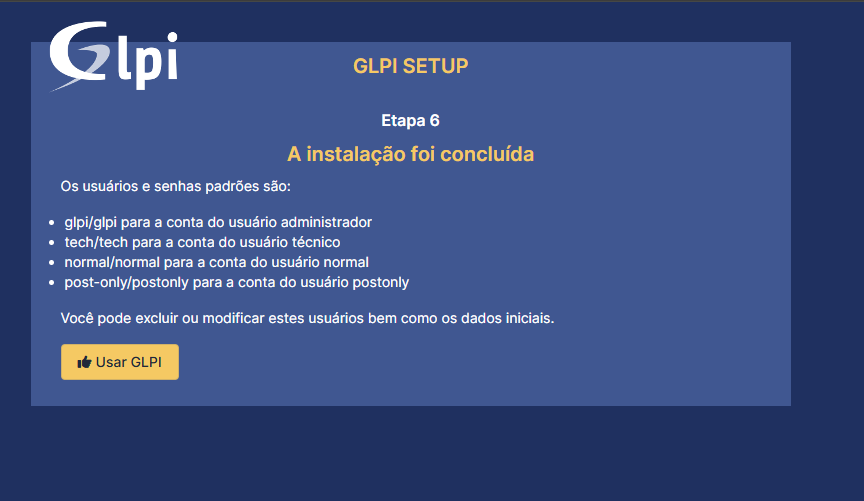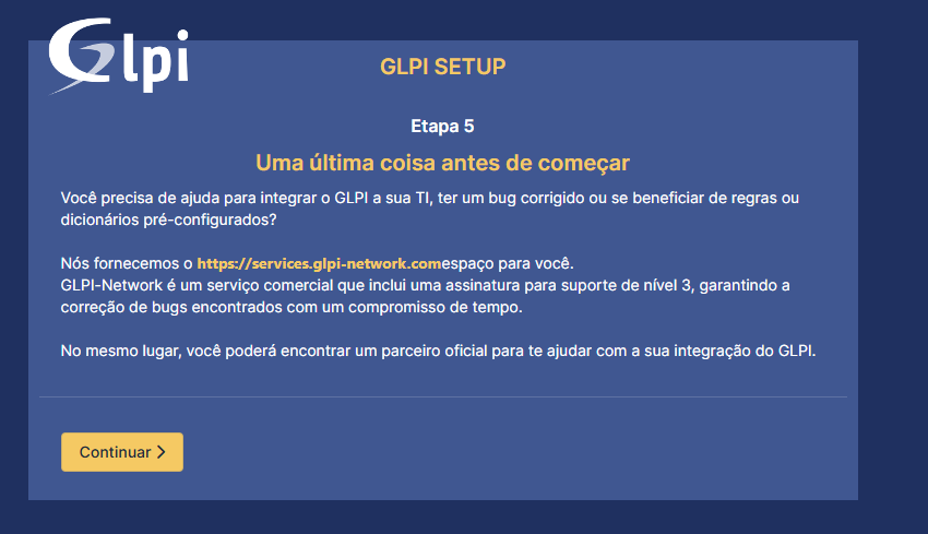 Depois que terminar a instalação, é só voltar pra página do GLPI e dar aquela clicada no botão laranja "Tentar Novamente":
