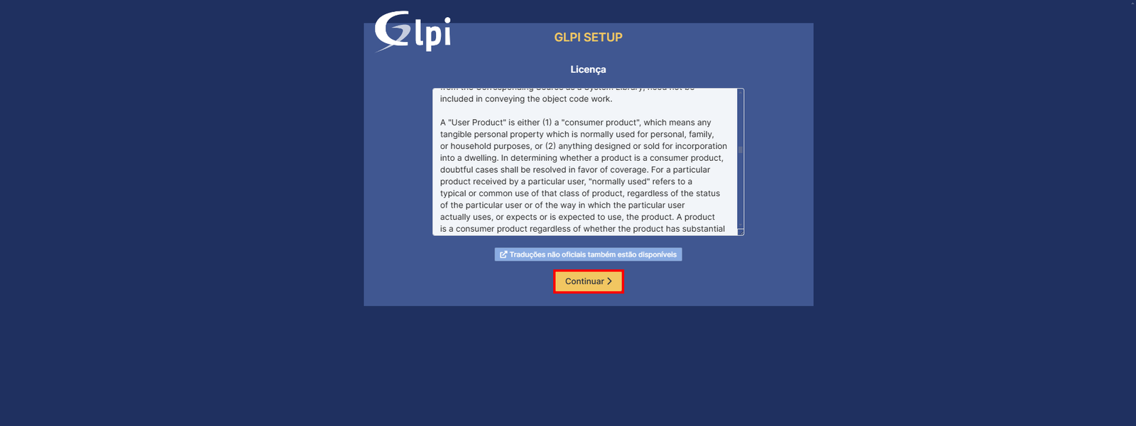 Em seguida, vamos dar de cara com os termos de uso e licença do software. Galera, eu sei que pode parecer chato, mas é super importante dar uma lida nesses termos, mesmo quando o software é gratuito como o GLPI. Depois que você der aquela conferida rápida, é só clicar no botão azul "Continuar" e seguir em frente: