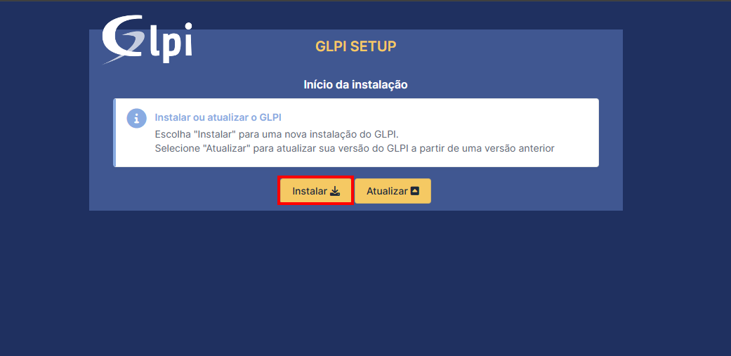 Beleza, agora vamos escolher se queremos instalar ou atualizar o GLPI. No nosso caso, vamos escolher instalar: