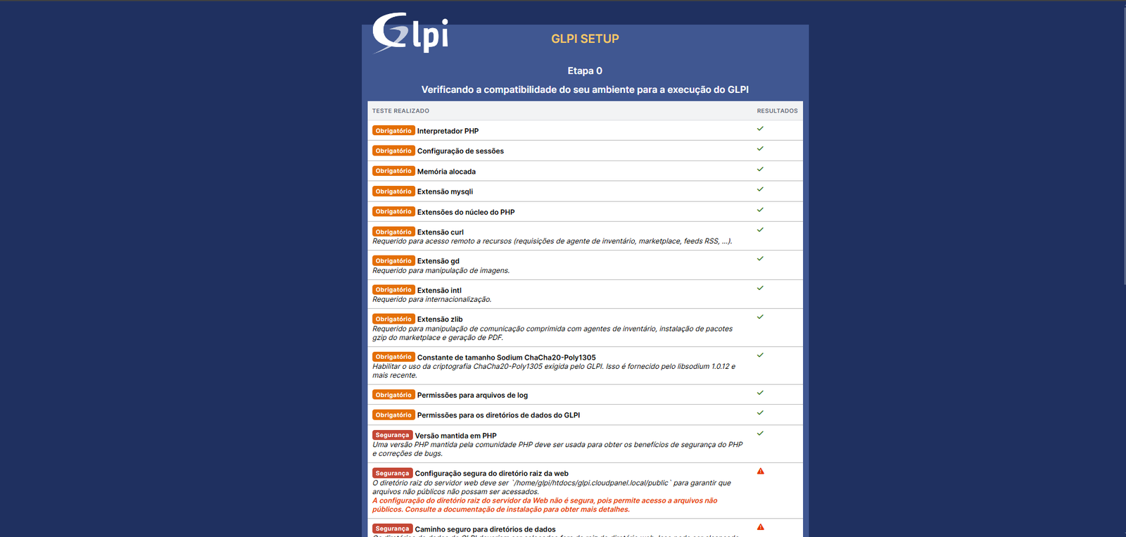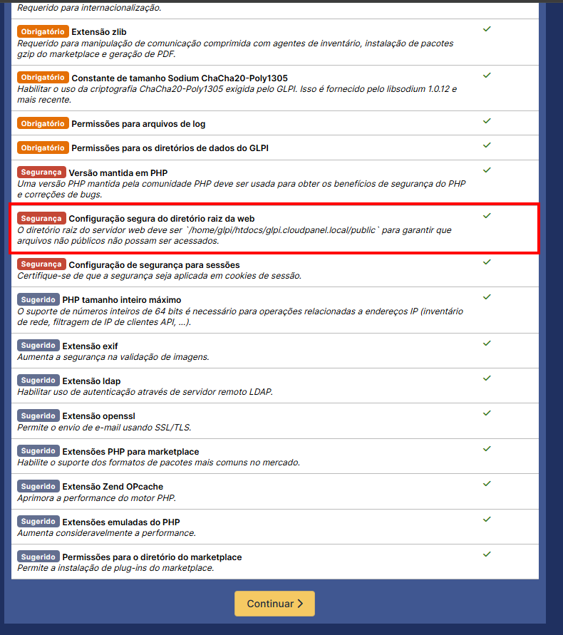 Depois disso, vamos clicar em "Salvar" no botão azul. Fazendo isso, nosso GLPI estará disponível com as configurações de segurança da pasta public aplicadas. Quando voltarmos para a página do GLPI, passaremos novamente pela configuração de idioma e aceitação da licença de uso. Ao chegarmos na página de verificação de compatibilidade, veremos que os avisos que solicitavam a modificação da pasta raiz agora estão verdes:
