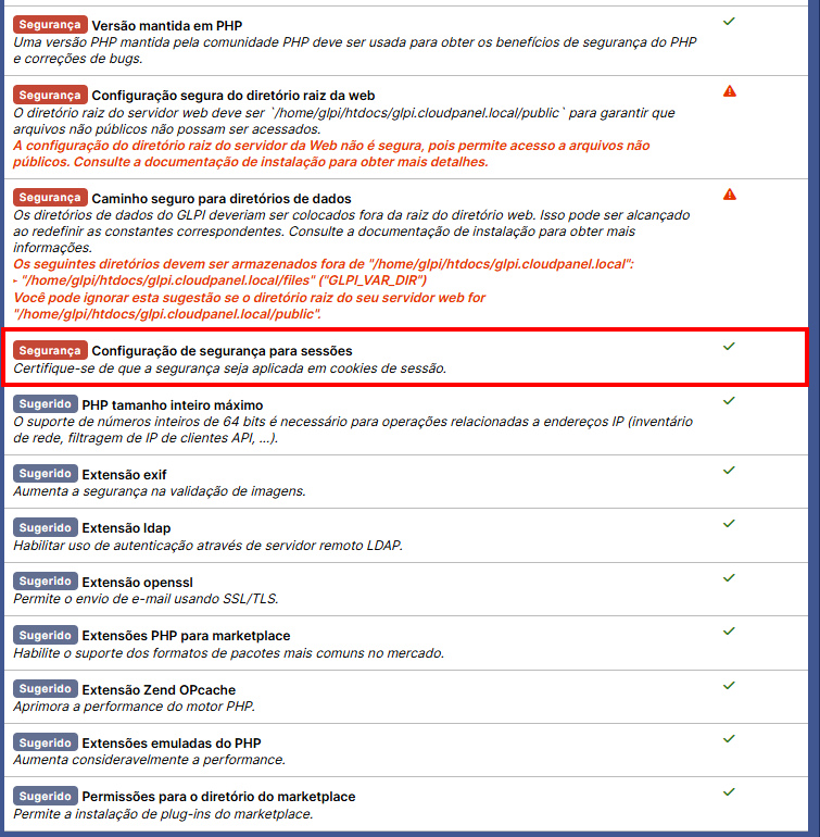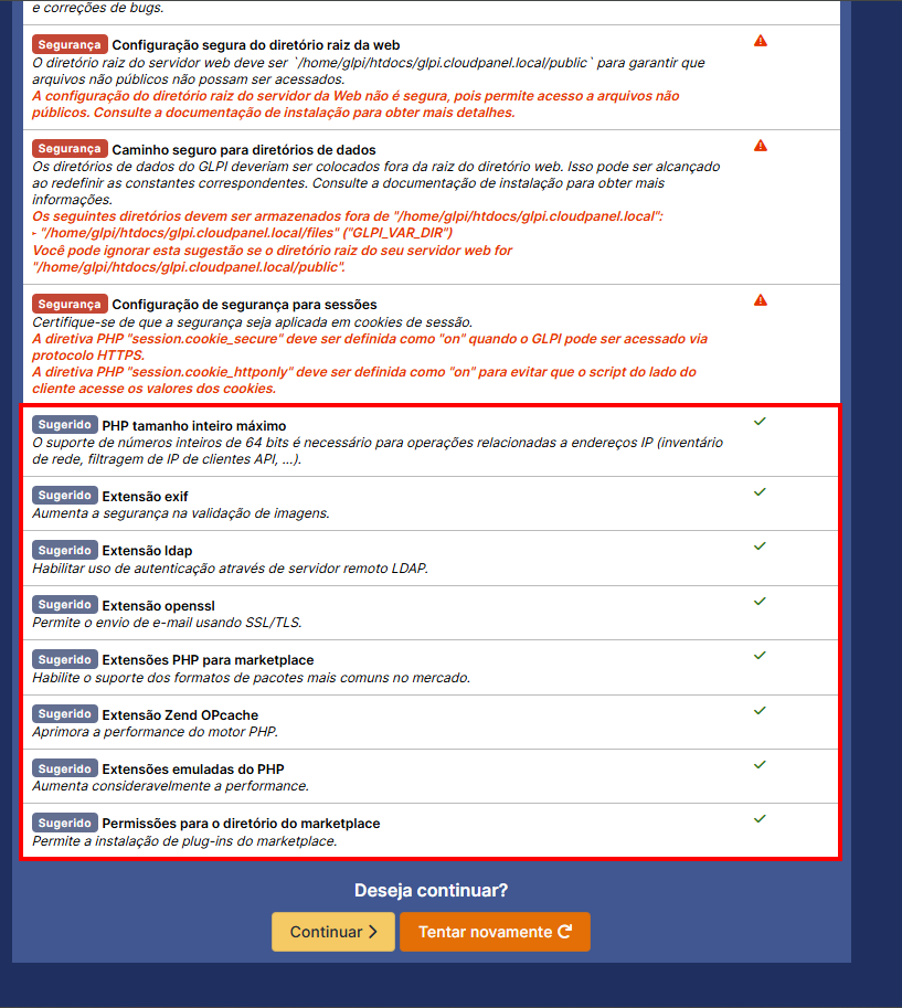 Agora, vamos voltar pro nosso GLPI e clicar em "Tentar Novamente", como a gente fez antes. Olha só que legal: os avisos relacionados às diretivas de sessão agora estão verdes também! Isso significa que as configurações que a gente fez funcionaram: