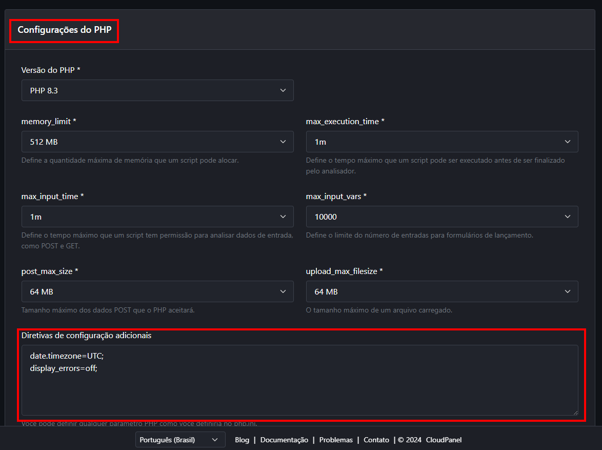 Agora, vamos rolar a página para baixo até encontrarmos as "Configurações de PHP". O campo que vamos modificar é o "Diretivas de configurações adicionais":