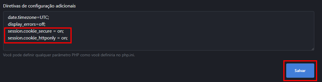 session.cookie_httponly = on;Depois disso, vamos salvar as configurações: