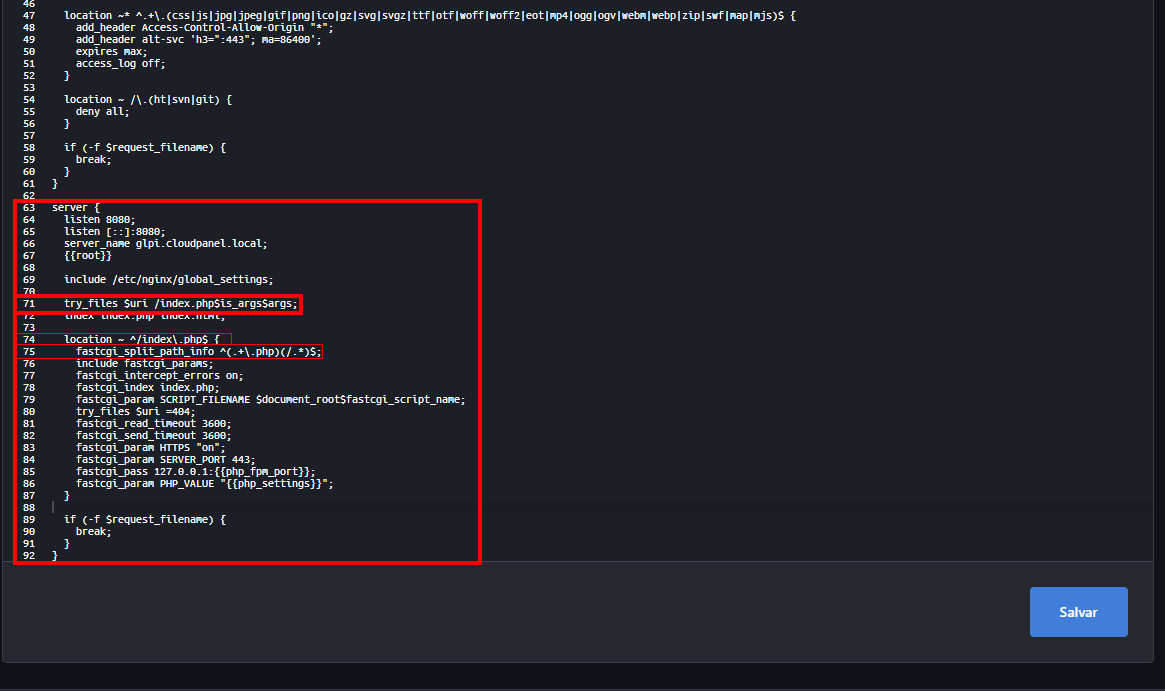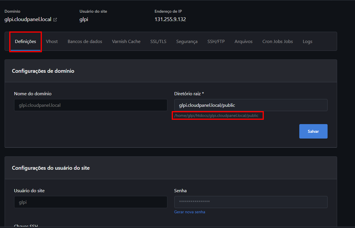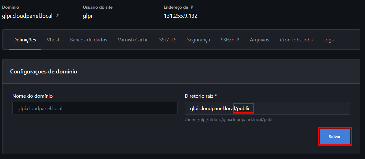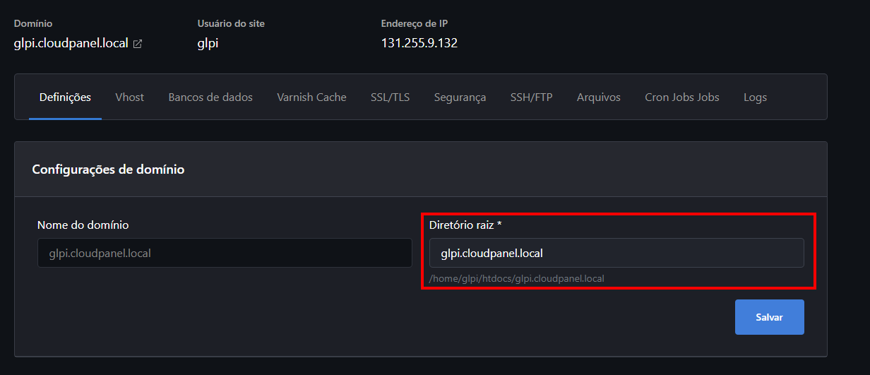 glpi.cloudpanel.local/publice logo depois clicaremos em "Salvar":
