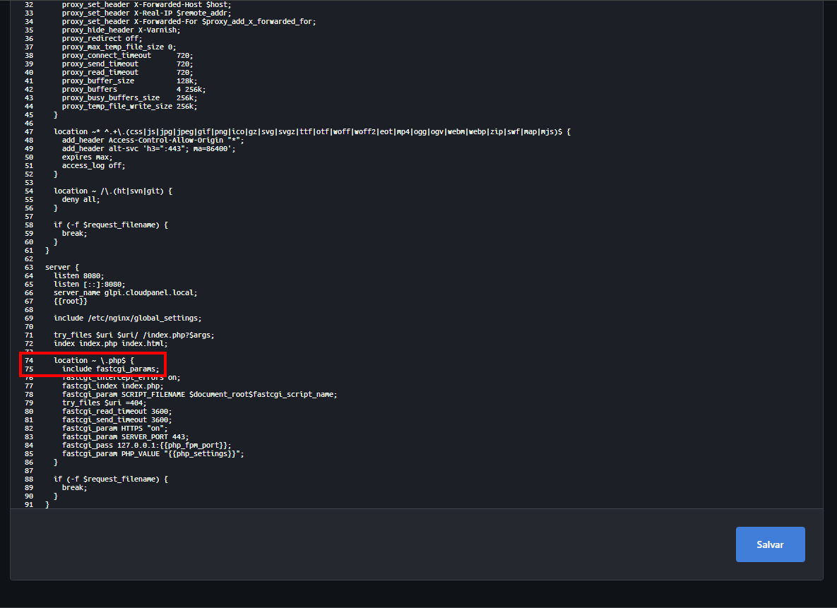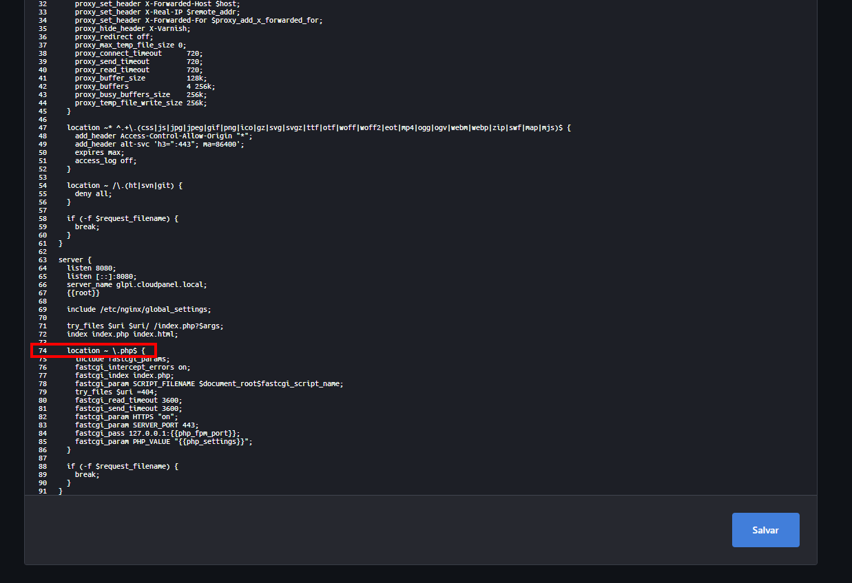 location ~ ^/index\.php$ {Ele substituir o que tá na linha 74 do nosso arquivo: