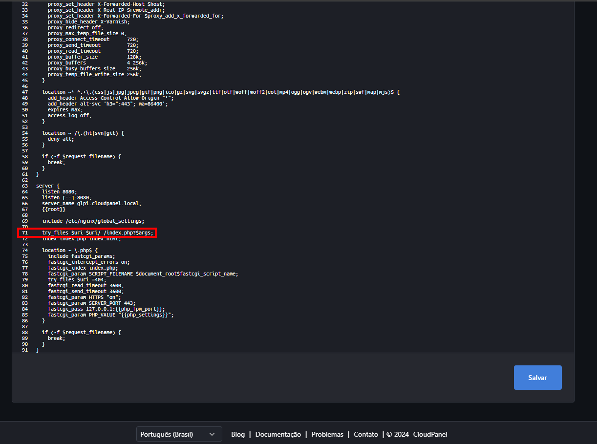 try_files $uri /index.php$is_args$args;substituirá a a configuração da linha 71