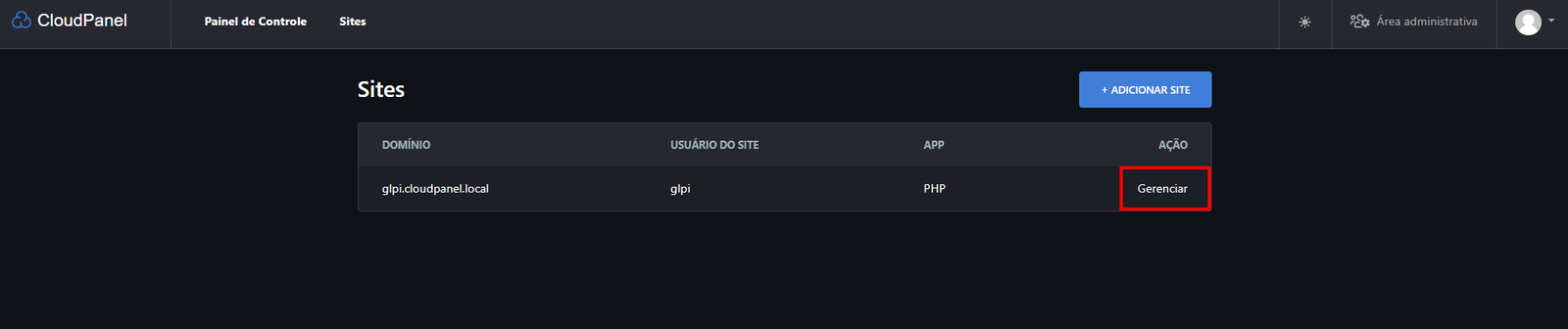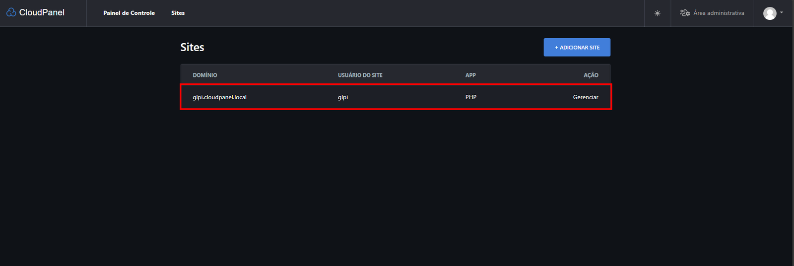 5 - Quando a gente voltar para o CloudPanel, vai ver o site que criamos para o GLPI na lista, igualzinho na imagem abaixo: