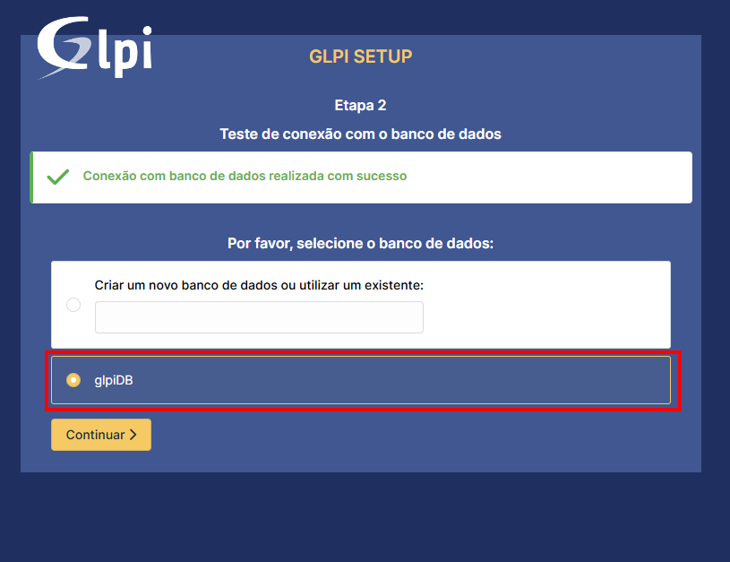 Depois de clicar em "Continuar", o GLPI vai mostrar para a gente uma lista dos bancos de dados que o usuário cadastrado tem acesso. No nosso caso, como a gente só cadastrou um banco lá no passo 3, item 3, vai aparecer só o glpiDB: