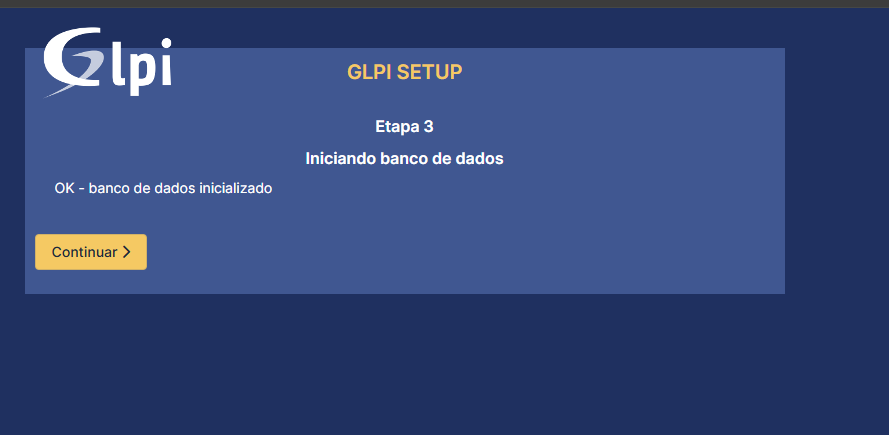 Beleza, galera! Depois de selecionar o banco de dados, é só clicar em "Continuar" e o GLPI vai começar a fazer a mágica acontecer: ele vai criar todas as tabelas e configurações necessárias. Não se preocupe se demorar um pouquinho, é normal! Quando todo esse processo estiver concluído, a gente vai chegar nesta tela: