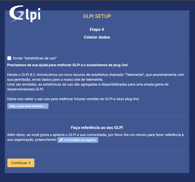 Aqui a gente pode escolher se quer mandar alguns dados anônimos pro pessoal do GLPI. Isso ajuda eles a entenderem melhor como o software está sendo usado. Também tem a opção de preencher um formulário de registro pra sua empresa aparecer na lista de referências. Dá uma olhada nessa lista aqui: