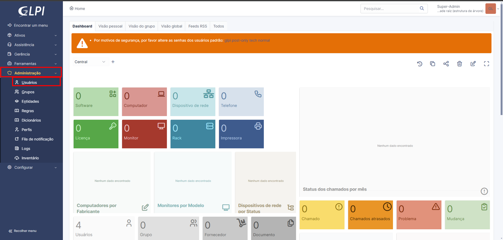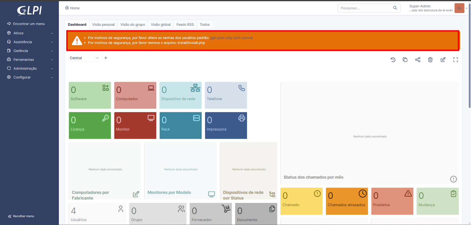 Depois de entrar, a gente vai ser redirecionado para o Dashboard do GLPI. Ó, presta atenção: vai ter um banner laranja dando uns avisos importantes. Ele vai dizer que a gente precisa trocar as senhas padrão dos usuários e remover o arquivo install.php. Essas são medidas de segurança super importantes, então vamos fazer isso, beleza?