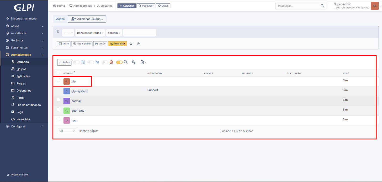 Depois disso, a gente vai ver a lista dos usuários padrões do GLPI. Vamos começar acessando o usuário glpi: