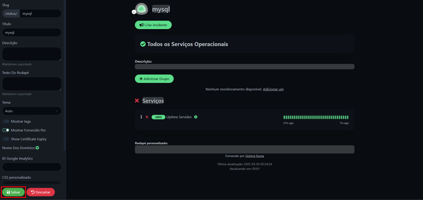 - Manter ou remover a marca do Uptime KUMA do rodapé da página;