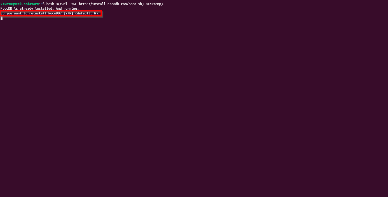 bash <(curl -sSL http://install.nocodb.com/noco.sh) <(mktemp)Aqui o script ir perguntar se você deseja reinstalar o NocoDB, digite "N":